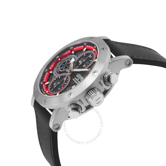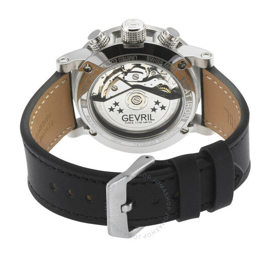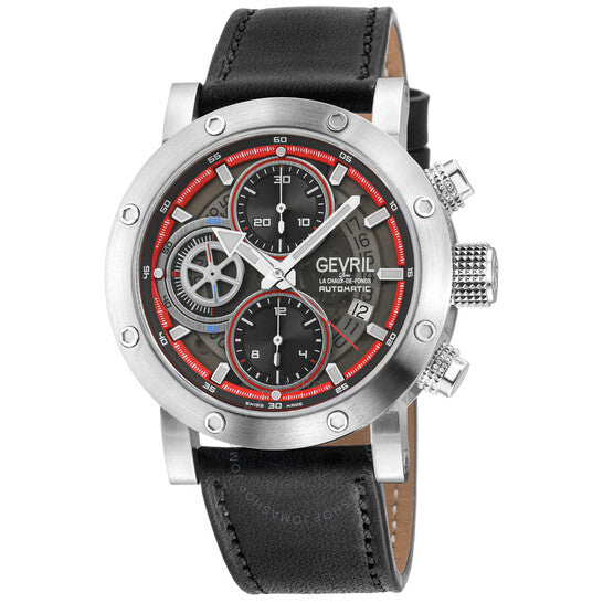 Silver-tone stainless steel case with a black leather strap. Fixed silver-tone stainless steel bezel. Grey dial with silver-tone hands and index hour markers. Minute markers around the outer rim. Dial Type: Analog. Luminescent hands and markers. Date display at the 4 o'clock position. Chronograph - three sub-dials displaying: 60 second, 30 minute and 12 hour. ETA-Valjoux Caliber 7750 Automatic movement, containing 25 Jewels, bitting at 28800 vph, and has a power reserve of approximately 44 hours. Scratch resistant sapphire crystal. Pull / push crown. Transparent case back. Round case shape, case size: 42 mm, case thickness: 14.5 mm. Band width: 20 mm. Buckle clasp. Water resistant at 50 meters / 165 feet. Functions: chronograph, date, day, hour, minute, second. Flat Iron Series. Luxury watch style. Watch label: Swiss Made. Gevril Flat Iron Chronograph Automatic Grey Dial Men's Watch 43710.