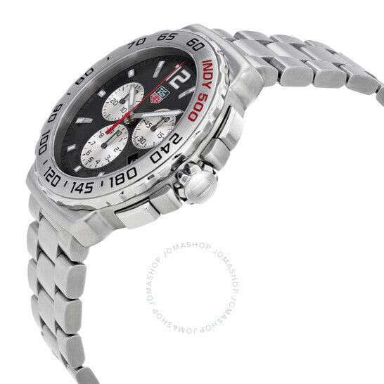Stainless steel case with a steel bracelet. Red Indy 500 engraved on the steel bezel Anthracite sunray dial with silver-tone hands and index hour markers. Arabic numeral at the 12 o'clock position. Minute markers around the outer rim. Dial Type: Analog. Luminescent hands and markers. Date display at the 4 o'clock position. Chronograph - three sub-dials displaying: 60 second, 30 minute and 1/10th of a second. Quartz movement. Scratch resistant sapphire crystal. Screw down crown. Solid case back. Case diameter: 42mm. Case thickness: 12 mm. Round case shape. Deployment clasp with push button. Water resistant at 200 meters / 660 feet. Functions: chronograph, date, hour, minute, second. Sport watch style. Watch label: Swiss Made.