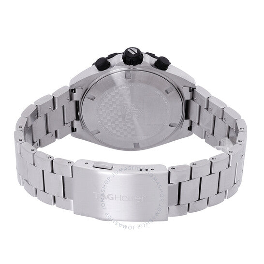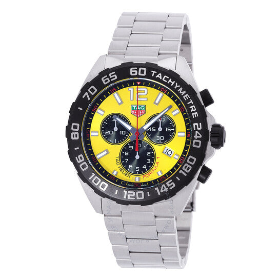 Silver-tone stainless steel case and bracelet. Black stainless steel bezel. Yellow dial with silver-tone hands and index-Arabic numeral hour markers. Minute markers around the outer rim. Dial Type: Analog. Luminescent hands and markers. Date display at the 4 o'clock position. Quartz movement. Scratch resistant sapphire crystal. Screw down crown. Solid case back. Round case shape, case size: 43 mm, case thickness: 12.4 mm. Fold over clasp with a safety release. Water resistant at 200 meters / 660 feet. Functions: chronograph, date, hour, minute, second. Formula 1 Series. Sport watch style. Watch label: Swiss Made. Tag Heuer Formula 1 Chronograph Quartz Men's Watch CAZ101AM.BA0842.