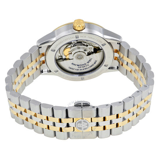 Silver-tone stainless steel case with a two-tone (silver-tone and yellow gold PVD ) stainless steel bracelet. Fixed yellow gold PVD stainless steel bezel. Black dial with luminous yellow gold-tone hands and index hour markers. Minute markers around the outer rim. Dial Type: Analog. Luminescent hands and markers. Date display at the 3 o'clock position. Raymond Weil Calibre RW 4420 Automatic movement, containing 26 Jewels, bitting at 28800 vph, and has a power reserve of approximately 38 hours. Scratch resistant sapphire crystal. Screw down crown. Transparent case back. Round case shape, case size: 42 mm, case thickness: 10.3 mm. Band width: 20 mm. Fold over with double push button release clasp. Water resistant at 100 meters / 330 feet. Functions: date, hour, minute, second. Freelancer Series. Dress watch style. Watch label: Swiss Made. Raymond Weil Freelancer Automatic Black Dial Men's Watch 2740-STP-20021.