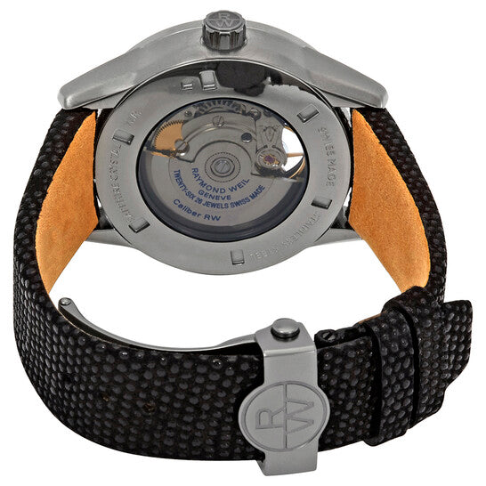Black PVD stainless steel case with a leather strap. Fixed bezel. Black dial with black hands and diamond hour markers. Dial Type: Analog. Automatic movement. Scratch resistant sapphire crystal. Transparent case back. Round case shape. Case size: 38 mm. Water resistant at 100 meters / 330 feet. Functions: hour, minute, second. Dress watch style. Watch label: Swiss Made. Raymond Weil Freelancer Automatic Black Diamond Dial Ladies Watch 2750-BK-20181.