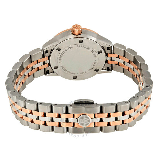 Stainless steel case with a two-tone (silver and rose gold PVD) stainless steel bracelet. Fixed rose gold PVD bezel. Black dial with luminous rose gold-tone hands and index hour markers. Minute markers around the outer rim. Dial Type: Analog. Luminescent hands and markers. Date display at the 3 o'clock position. Quartz movement. Scratch resistant sapphire crystal. Screw down crown. Solid case back. Round case shape. Case size: 29 mm. Case thickness: 7.65 mm. Fold over clasp with a push button release. Water resistant at 100 meters / 330 feet. Functions: date, hour, minute, second. Dress watch style. Watch label: Swiss Made. Raymond Weil Freelancer Black Dial Ladies Watch 5629-SP5-20021.
