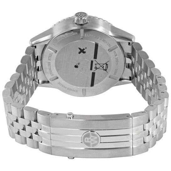Stainless steel case with a stainless steel bracelet. Uni-directional rotating stainless steel bezel with a black ceramic ring. Black (maple leaf) dial with luminous silver-tone hands and index hour markers. Minute markers around the outer rim. Dial Type: Analog. Luminescent hands and markers. Date display at the 4 o'clock position. Automatic movement. Scratch resistant sapphire crystal. Pull / push crown. Solid case back. Round case shape. Case size: 42.5 mm. Case thickness: 10 mm. Band width: 22 mm. Fold over clasp. Water resistant at 300 meters / 1000 feet. Functions: date, hour, minute, second. Dive watch style. Watch label: Swiss Made. Raymond Weil Freelancer Canada Automatic Black Dial Men's Watch 2760-ST5-CA150.
