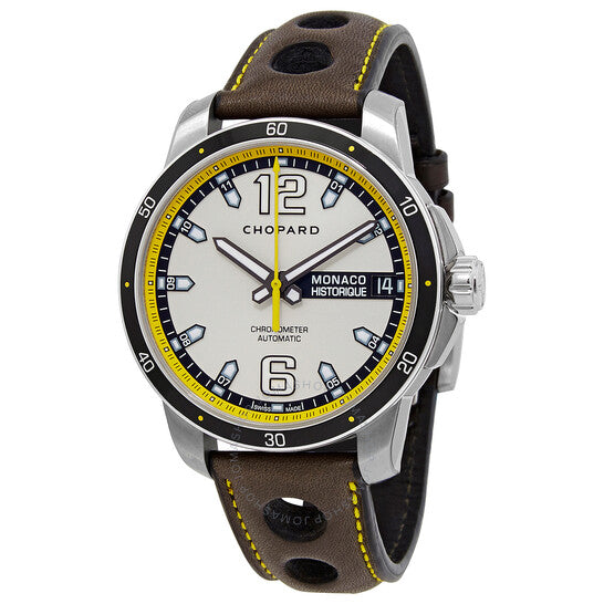 Grey titanium case with a perforated brown (calfskin barenia) leather strap. Fixed grey titanium bezel with a black top ring. Snailed grey dial with luminous hands and index / small Arabic numeral hour markers. Large Arabic numerals appear at the 6 and 12 o'clock positions. Minute markers around the outer rim. Dial Type: Analog. Luminescent hands and markers. Date display at the 3 o'clock position. Automatic movement with a 46-hour power reserve. Scratch resistant sapphire crystal. Pull / push crown. Solid stainless steel case back. Case diameter: 44.50 mm. Case thickness: 13.90 mm. Round case shape. Fold over clasp. Water resistant at 100 meters / 330 feet. Functions: date, hour, minute, second. Luxury watch style. Watch label: Swiss Made. Chopard G.P.M.H. Titanium and Steel Men's Watch 168568-3001.