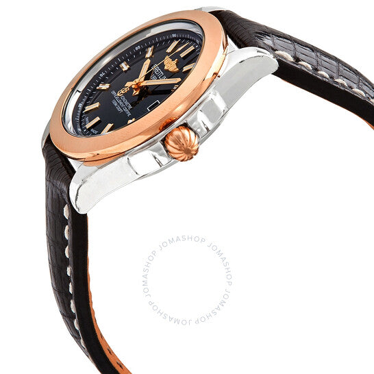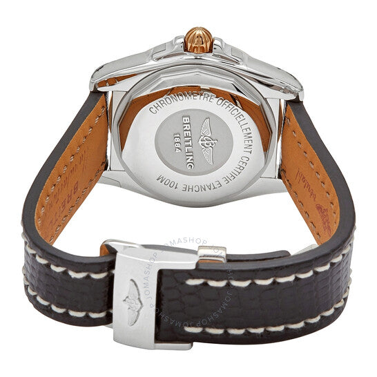 Silver-tone stainless steel case with a black leather strap. Fixed rose gold-tone stainless steel bezel. Black dial with rose gold-tone hands and index hour markers. Minute markers around the outer rim. Dial Type: Analog. Luminescent hands and markers. Date display at the 3 o'clock position. Breitling Calibre 71 quartz movement. Scratch resistant sapphire crystal. Screw down crown. Solid case back. Round case shape. Case size: 32 mm. Tang clasp. Water resistant at 100 meters / 330 feet. Functions: date, hour, minute, second, chronometer. Sport watch style. Watch label: Swiss Made. Breitling Breitling Galactic 32 Quartz Chronometer Black Dial Ladies Watch C7133012-BF65-132Z.