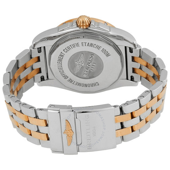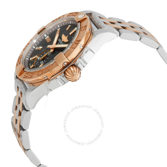 Stainless steel and 18k rose gold case and bracelet. Uni-directional rotating bezel. Black dial with rose gold-tone hands and index hour markers. Minute markers around the outer rim. Dial Type: Analog. Luminescent hands and markers. Date display at the 3 o'clock position. One subdial displaying: small second. Breitling Calibre 37 Automatic movement, based upon ETA 2895-2, containing 27 Jewels, bitting at 28800 vph, and has a power reserve of approximately 42 hours. Scratch resistant sapphire crystal. Round case shape, case size: 36 mm. Deployment clasp. Water resistant at 100 meters / 330 feet. Functions: date, hour, minute, small second. Galactic 36 Series. Luxury watch style. Watch label: Swiss Made. Breitling Galactic 36 Automatic Black Dial Men's Watch C3733012/BA54-376C.