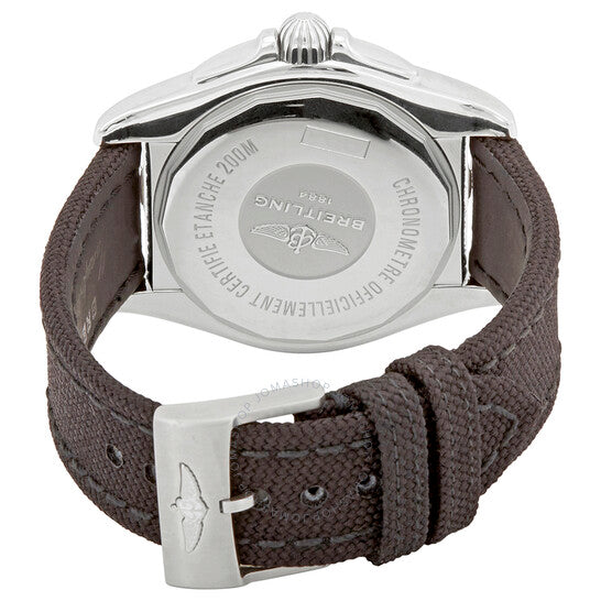 Stainless steel case with a black fabric strap. Uni-directional rotating stainless steel bezel. Black dial with luminous silver-tone hands and index hour markers. Minute markers. Compass markings (360 degrees). 1/100th second markers around the outer rim. Dial Type: Analog. Luminescent hands and markers. Date display at the 3 o'clock position. Day of the week display centered on the 12 o'clock position. Breitling calibre 45 automatic movement with a 42-hour power reserve. Scratch resistant sapphire crystal. Screw locked crown. Solid case back. Round case shape. Case size: 44 mm. Case thickness: 14.3 mm. Band width: 20 mm. Tang clasp. Water resistant at 200 meters / 660 feet. Functions: date, day, hour, minute, second. Luxury watch style. Watch label: Swiss Made. Item Variations: A45320B9-BD42-103W-A20BASA.1. Breitling Galactic 44 Automatic Black Dial Men's Watch A45320B9/BD42BKFT.