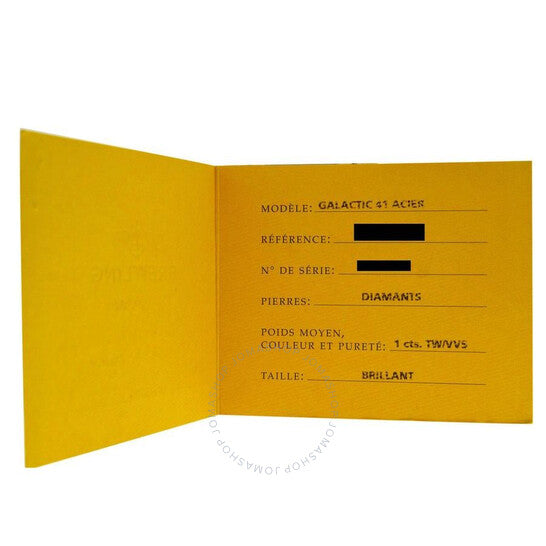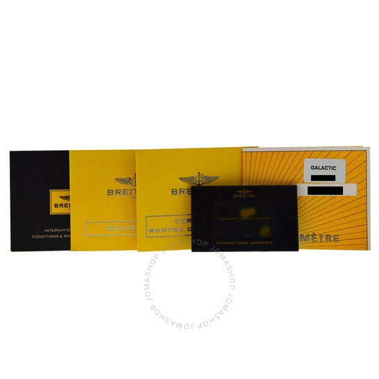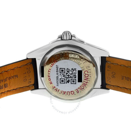 Silver-tone stainless steel case with a black leather strap. Uni-directional rotating silver-tone bezel with diamond set stainless steel. Black dial with silver-tone hands and index hour markers. Minute markers around the outer rim. Dial Type: Analog. Luminescent hands and markers. Date display at the 3 o'clock position. Breitling Calibre 49 Automatic movement, based upon ETA 2896, containing 21 Jewels, bitting at 28800 vph, and has a power reserve of approximately 42 hours. Scratch resistant sapphire crystal. Screw down crown. Solid case back. Round case shape, case size: 41 mm. Water resistant at 300 meters / 1000 feet. Functions: big date, hour, minute, second, chronometer. Galactic Series. Casual watch style. Watch label: Swiss Made. Breitling Galactic Automatic Chronometer Diamond Black Dial Men's Watch A49350LA/BA07-429X.
