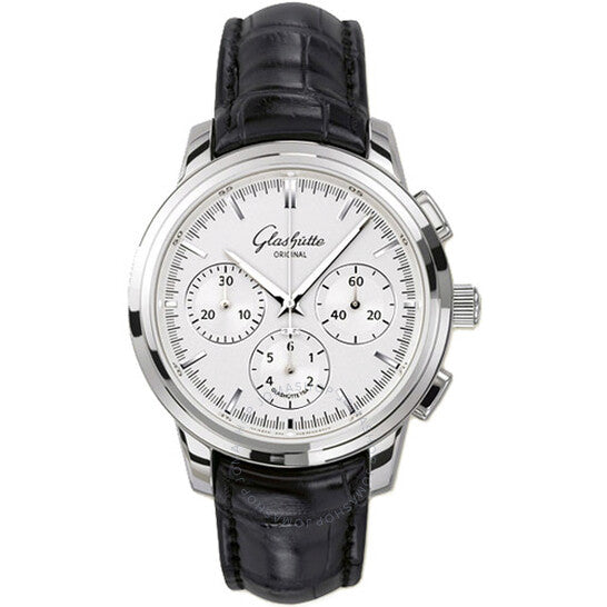 Stainless steel case with a black croco-embossed leather bracelet. Fixed stainless steel bezel. Silver dial with silver-tone hands and stick hour markers. Minute markers around the outer rim. Chronograph - three sub-dails displaying: 60 secomds, 30 minutes and 6 hours. Stop watch function. Automatic movement. Scratch resistant sapphire crystal. Steel crown. Skeletal case back. Case diameter: 40 mm. Case thickness: 14 mm. Deployant clasp. Water resistant at 50 meters / 165 feet. Glashutte Men's Chronograph Watch 3931454204.