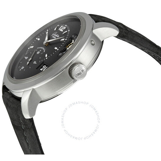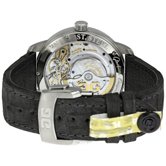 Stainless steel case with a black croco-embossed leather strap. Fixed stainless steel bezel. Grey dial with luminous white gold hands and index hour markers. Arabic numeral marks the 12 o'clock position. Minute markers. Luminescent hands and markers. Date display at the 4 o'clock position. Seconds sub-dial. Moonphase indicator sub-dial at the 2 o'clock position. Automatic movement. Scratch resistant sapphire crystal. Skeleton case back. Case diameter: 42 mm. Case thickness: 12.5 mm. Deployment clasp. Water resistant at 30 meters / 100 feet.