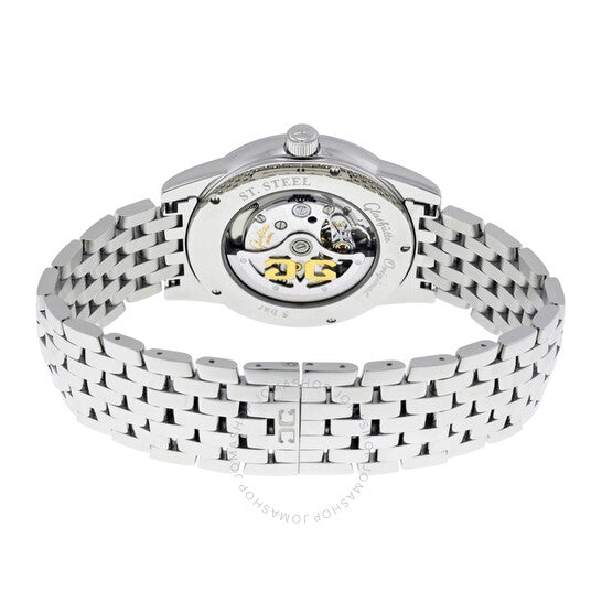 Stainless steel case with a stainless steel bracelet. Fixed stainless steel bezel. Black dial with luminous silver-tone hands and index hour markers. Minute markers around the outer rim. Dial Type: Analog. Luminescent hands. Date display at the 3 o'clock position. Two sub-dials displaying: 60 second and date. Glashutte calibre 39-58 automatic movement with a 40 -hour power reserve. Scratch resistant sapphire crystal. Pull / push crown. Transparent case back. Case size: 40 mm. Case thickness: 11.2 mm. Round case shape. Fold over clasp. Water resistant at 50 meters / 165 feet. Functions: date, hour, minute, second. Luxury watch style. Watch label: Made In Germany. Glashutte Senator Automatic Black Dial Men's Watch 39-58-01-02-14.
