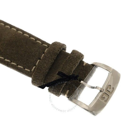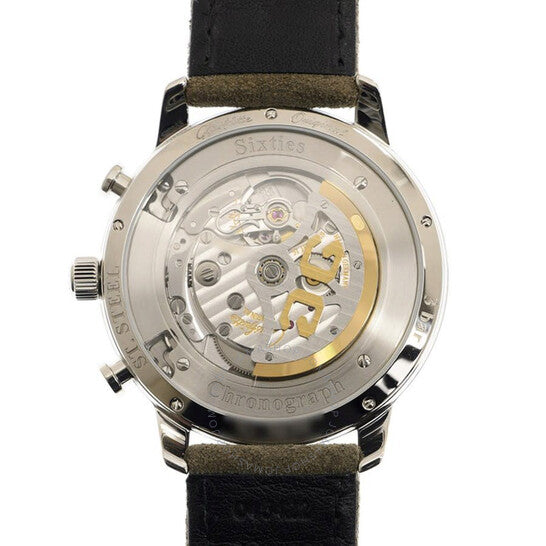 Stainless steel case with a brown (calfskin) leather strap. Fixed stainless steel bezel. Green and black dial with luminous silver-tone hands and index hour markers. Minute markers around the outer rim. Dial Type: Analog. Luminescent hands and markers. Chronograph - two sub-dials displaying: 60 second and 30 minute. Glashutte calibre 39-34 automatic movement, containing 51 Jewels, bitting at 28800 vph, and has a power reserve of approximately 40 hours. Scratch resistant sapphire crystal. Pull / push crown. Transparent case back. Round case shape. Case size: 42 mm. Case thickness: 12.4 mm. Band width: 22 mm. Tang clasp. Water resistant at 30 meters / 100 feet. Functions: chronograph, hour, minute, second. Additional Info: original box, manual (complete accessories). Sixties Series. Luxury watch style. Watch label: Made in Germany. Glashutte Sixties Chronograph Automatic Green Dial Men's Watch 1-39-34-05-22-04.