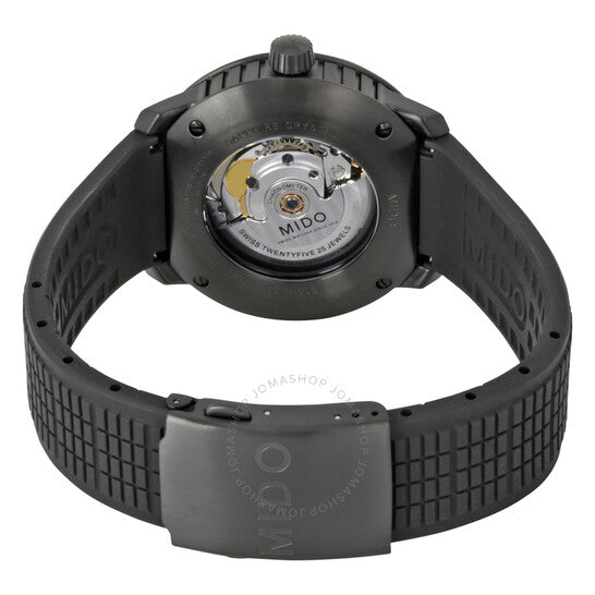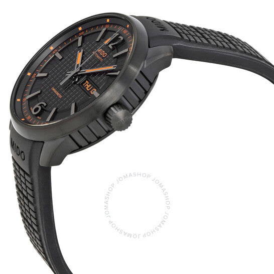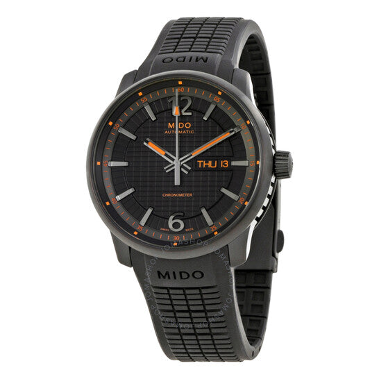 Black PVD stainless steel watch case with a black rubber strap. Fixed black PVD bezel. Black dial with black hands and index hour markers. Arabic numerals mark the 6 and 12 o'clock positions. Minute markers around the outer rim. Dial Type: Analog. Luminescent hands and markers. Day of the week and date display at the 3 o'clock position. ETA 2836-2 (COSC) automatic movement with a 40-hour power reserve. Scratch resistant sapphire crystal. Screw down crown. Transparent case back. Case size: 42 mm. Case thickness: 10.92 mm. Round case shape. Band width: 22 mm. Deployment clasp with a push button release. Water resistant at 100 meters / 330 feet. Functions: date, day, hour, minute, second. Dress watch style. Watch label: Swiss Made. Mido Great Wall Black Dial Automatic Men's Watch M019.631.37.057.00.