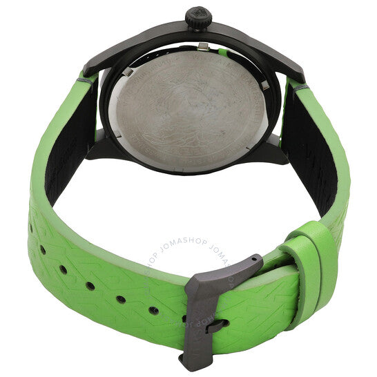 Gunmetal stainless steel case with a green leather strap. Gunmetal stainless steel bezel. Pink dial with black hands and index hour markers. Minute markers around the outer rim. Dial Type: Analog. Luminescent hands and markers. Date display at the 3 o'clock position. Quartz movement. Scratch resistant sapphire crystal. Pull / push crown. Solid case back. Round case shape, case size: 41 mm, case thickness: 9 mm. Band width: 20 mm. Buckle clasp. Water resistant at 50 meters / 165 feet. Functions: GMT, hour, minute, second. Greca Time Series. Casual watch style. Watch label: Swiss Made. Versace Greca Time GMT Quartz Pink Dial Men's Watch VE7C00323.