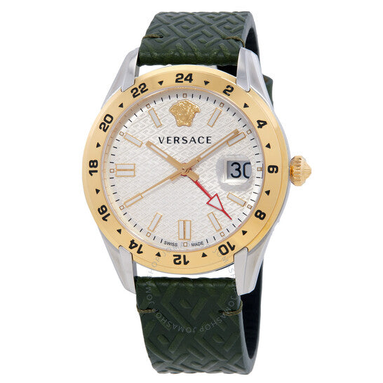 Silver-tone stainless steel case with a green leather strap. Fixed gold-tone stainless steel bezel. Silver dial with gold-tone hands and index hour markers. Minute markers around the outer rim. Dial Type: Analog. Luminescent hands and markers. Date display at the 3 o'clock position. Quartz movement. Scratch resistant sapphire crystal. Pull / push crown. Solid case back. Round case shape, case size: 41 mm. Water resistant at 50 meters / 165 feet. Functions: date, GMT, second time zone, hour, minute, second. Greca Time Series. Watch label: Swiss Made. Versace Greca Time GMT Quartz Silver Dial Men's Watch VE7C00223.