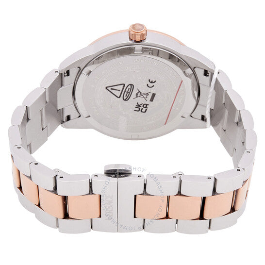 Silver-tone stainless steel case with a two-tone (silver-tone and rose gold-tone) stainless steel bracelet. Fixed green stainless steel bezel. Green dial with rose gold-tone hands and index hour markers. Minute markers around the outer rim. Dial Type: Analog. Date display at the 3 o'clock position. Quartz movement. Scratch resistant sapphire crystal. Pull / push crown. Solid case back. Round case shape, case size: 43 mm. Band width: 22 mm. Deployment with push button release clasp. Water resistant at 50 meters / 165 feet. Functions: date, hour, minute, second. Greca Urban Series. Casual watch style. Watch label: Swiss Made. Versace Greca Urban Quartz Green Dial Men's Watch VEYCA0624.