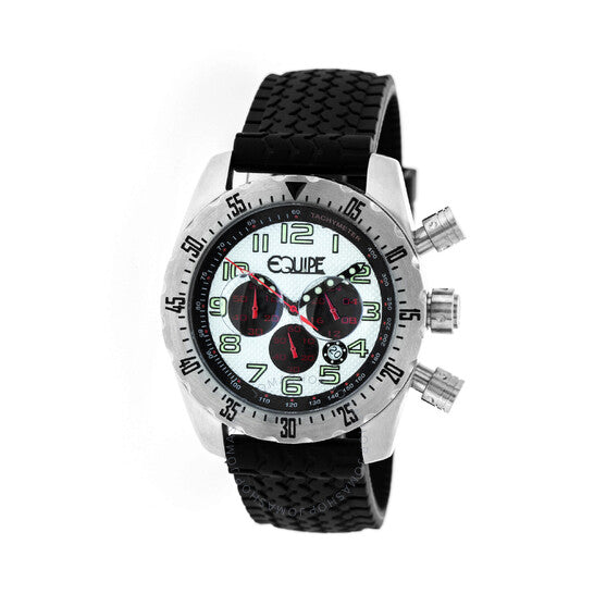 Stainless steel case with a black rubber strap. Uni-directional rotating stainless steel bezel. White dial with luminous hands and Arabic numeral hour markers. Tachymeter around the outer rim. Dial Type: Analog. Luminescent hands. Date display between 4 and 5 o'clock position. Chronograph - three sub-dials displaying: 60 second, 60 minute and 24 hour. Quartz movement. Scratch resistant mineral crystal. Screw down crown. Screw in case back. Case diameter: 46 mm. Case thickness: 14 mm. Round case shape. Band width: 23 mm. Tang clasp. Water resistant at 100 meters (330 feet). Functions: chronograph, hour, minute, second. Sport watch style. Equipe Headlight Chronograph White Dial Black Leather Men's Watch E601.