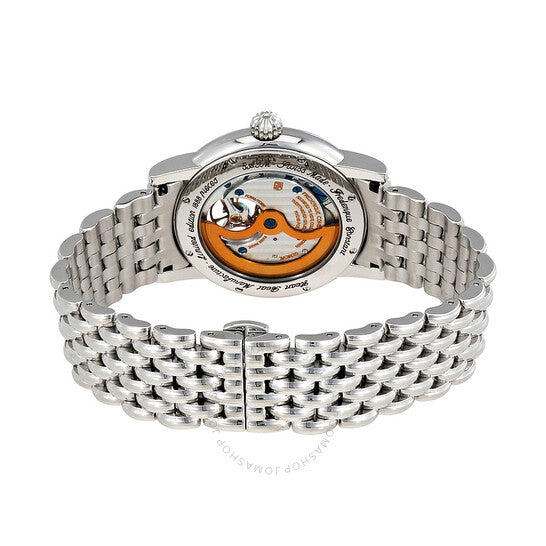 Stainless steel case with a stainless steel bracelet. Fixed bezel. Black and silver dial with silver-tone hands and index and Arabic numeral hour markers. Minute markers around the outer rim. Dial Type: Analog. Automatic movement. Scratch resistant sapphire crystal. Transparent case back. Case size: 41 mm. Case thickness: 10 mm. Round case shape. Tang clasp. Water resistant at 50 meters / 165 feet. Functions: hour, minute, second. Luxury watch style. Watch label: Swiss Made. Frederique Constant Heart Beat Black and Silver Dial Men's Watch FC-930ABS4H6B.