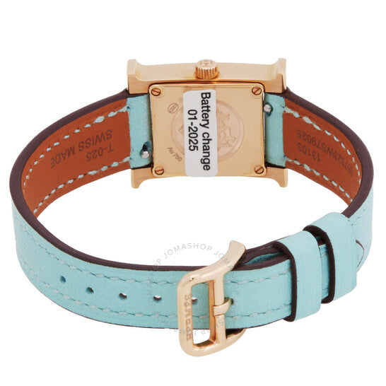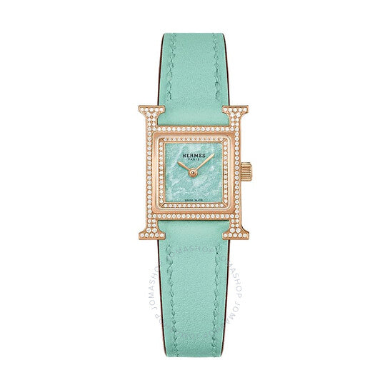 Diamond-set 18kt rose gold case, 116 diamonds (0.233 ct. Bleu aqua leather strap. Fixed bezel. Bleu aqua mother of pearl dial with rose gold-tone hands. No markers. Dial Type: Analog. Quartz movement. Scratch resistant sapphire crystal. Solid case back. Case size: 21 mm. Buckle clasp. Water resistant at 30 meters / 100 feet. Functions: hour, minute. Heure H Series. Luxury watch style. Watch label: Swiss Made. Hermes Heure H Mini Model Diamond Quartz Ladies Watch 057325WW00.