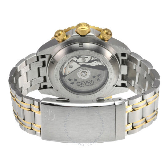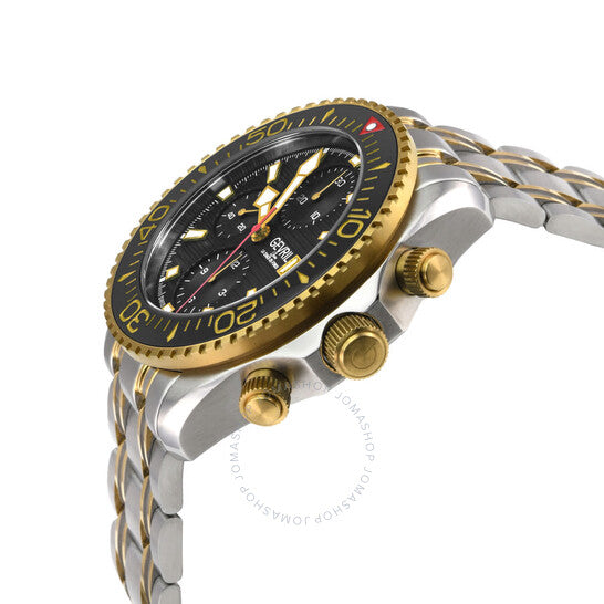 Silver-tone stainless steel case with a two-tone (silver-tone and yellow gold-tone) stainless steel bracelet. Uni-directional rotating black stainless steel bezel. Black dial with yellow gold-tone hands and index hour markers. Minute markers around the outer rim. Dial Type: Analog. Luminescent hands and markers. Date display at the 3 o'clock position. Chronograph - three sub-dials displaying: 60 second, 30 minute and 12 hour. Sellita Caliber SW500 Automatic movement, containing 25 Jewels, bitting at 28800 vph, and has a power reserve of approximately 44 hours. Scratch resistant sapphire crystal. Screw down crown. Transparent case back. Round case shape, case size: 43 mm, case thickness: 17 mm. Band width: 20 mm. Deployment with push button release clasp. Water resistant at 300 meters / 1000 feet. Functions: chronograph, date, day, hour, minute, small second. Additional Info: helium release valve, chronograph. Hudson Yards Chronograph Series. Luxury watch style. Watch label: Swiss Made. Gevril Hudson Yards Chronograph Automatic Black Dial Men's Watch 48812B.