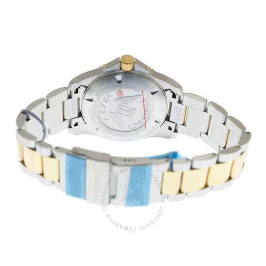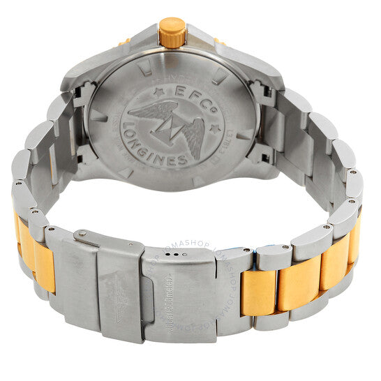 Stainless steel case with a two-tone (silver-tone and yellow gold-tone) stainless steel bracelet. Uni-directional rotating yellow gold-tone bezel with an inlaid black ceramic ring. Black dial with luminous yellow gold-tone hands and index hour markers. Arabic numerals appear at the 6, 9 and 12 o'clock positions, inute markers around the outer rim. Dial Type: Analog. Luminescent hands and markers. Date display at the 3 o'clock position. Longines calibre L888 automatic movement, based upon ETA A31.L11, containing 21 Jewels, bitting at 25200 vph, and has a power reserve of approximately 64 hours. Scratch resistant sapphire crystal. Screw down crown. Solid case back. Round case shape. Case size: 41 mm. Fold over clasp. Water resistant at 300 meters / 1000 feet. Functions: date, hour, minute, second. Additional Info: original box, manual (complete accessories). Hydroconquest Series. Luxury watch style. Watch label: Swiss Made. Longines HydroConquest Automatic Black Dial Men's Watch L3.781.3.56.7.