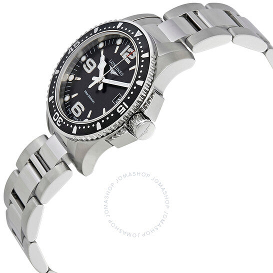 Stainless steel case with a stainless steel bracelet. Uni-directional rotating coin edge stainless steel bezel with a black (count-up elapsed time) top ring. Black dial with luminous silver-tone snowflake-shape hands and dot hour markers. Arabic numerals mark the 6, 9 and 12 o'clock positions. Minute markers around the outer rim. Dial Type: Analog. Luminescent hands and markers. Date display at the 3 o'clock position. Longines Calibre L156 quartz movement. Scratch resistant sapphire crystal. Screw down crown. Solid case back. Round case shape. Case size: 34 mm. Case thickness: 10.8 mm. Band width: 17 mm. Fold over clasp with a safety release. Water resistant at 300 meters / 1000 feet. Functions: date, hour, minute, second. Hydroconquest Series. Dive watch style. Watch label: Swiss Made. Longines HydroConquest Black Dial 34 mm Ladies L33404566.