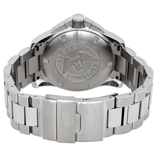Stainless steel case with a stainless steel bracelet. Uni-directional rotating coin edge stainless steel bezel with a blue (count-up elapsed time) top ring. Blue dial with luminous silver-tone hands and dot hour markers. An Arabic numeral appears at the 12 o'clock position. Minute markers. 1/100th second markers around the outer rim. Dial Type: Analog. Luminescent hands and markers. Date display at the 4 o'clock position. Chronograph - three sub-dials displaying: 60 second, 30 minute and 12 hour. Longines calibre L440 quartz movement. Scratch resistant sapphire crystal. Screw down crown. Solid case back. Round case shape. Case size: 47.5 mm. Case thickness: 11.5 mm. Band width: 24 mm. Fold over clasp with a push button release. Water resistant at 300 meters / 1000 feet. Functions: chronograph, date, hour, minute, second. Conquest Series. Dive watch style. Watch label: Swiss Made. Longines HydroConquest Chronograph Blue Dial Men's Watch L38434966.