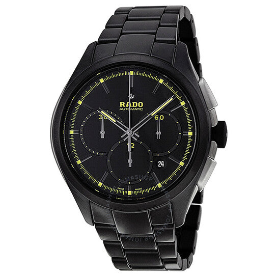 Black (high-tech) ceramic case and bracelet. Fixed black (high-tech) ceramic bezel. Black dial with luminous hands and stick hour markers. Minute markers around the outer rim. Dial Type: Analog. Luminescent hands and markers. Date display between the 4 and 5 o'clock positions. Chronograph - three sub-dials displaying: 60 second, 30 minute and 12 hour. ETA caliber 2894-2 automatic movement, based upon ETA 2892-2, containing 37 Jewels, bitting at 28800 vph, and has a power reserve of approximately 38 hours. Scratch resistant sapphire crystal. Pull / push crown. Transparent case back. Round case shape. Case size: 45 mm. Case thickness: 13 mm. Band width: 21 mm. Fold over clasp with a push button release. Water resistant at 100 meters / 330 feet. Functions: chronograph, date, hour, minute, second. Hyperchrome Series. Dress watch style. Watch label: Swiss Made. Rado Hyperchrome Automatic Chronograph Black High-Tech Ceramic Men's Watch R32525172.