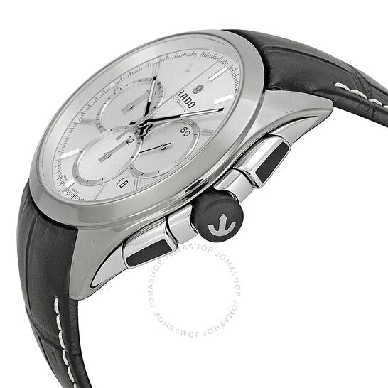 Plasma (high-tech) ceramic case with a black leather strap. Fixed plasma (high-tech) ceramic bezel. Black dial with luminous silver-tone hands and index hour markers. Minute markers around the outer rim. Dial Type: Analog. Luminescent hands and markers. Date display between the 4 and 5 o'clock positions. Chronograph - three sub-dials displaying: 60 second, 30 minute and 12 hour. ETA caliber 2894-2 automatic movement, based upon ETA 2892-2, containing 37 Jewels, bitting at 28800 vph, and has a power reserve of approximately 38 hours. Scratch resistant sapphire crystal. Screw down crown. Transparent case back. Round case shape. Case size: 45 mm. Case thickness: 13 mm. Band width: 21 mm. Tang clasp. Water resistant at 100 meters / 330 feet. Functions: chronograph, date, hour, minute, second. Dress watch style. Watch label: Swiss Made. Rado Hyperchrome Automatic Silver Dial Black Leather Men's Watch R32276105.