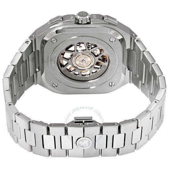 Silver-tone stainless steel case with a brushed & polished stainless steel bracelet. Fixed silver-tone stainless steel bezel. Black dial with luminous silver-tone hands and index hour markers. Arabic numerals appear at the 6 and 12 o'clock positions. Minute markers. Arabic numeral minute markers (at 5 minute intervals) around the outer rim. Dial Type: Analog. Luminescent hands and markers. Date display between the 4 and 5 o'clock position. Chronograph - two sub-dials displaying: 60 second and 30 minute. Bell and Ross Calibre BR-CAL.301 Automatic movement, based upon ETA 2894-2, containing 37 Jewels, bitting at 28800 vph, and has a power reserve of approximately 42 hours. Scratch resistant sapphire crystal. Screw down crown. Transparent case back. Square case shape, case size: 42 mm, case thickness: 11 mm. Fold over clasp with a safety release. Water resistant at 100 meters / 330 feet. Functions: chronograph, date, hour, minute, second. Instruments Series. Luxury watch style. Watch label: Swiss Made. Bell and Ross Instruments Chronograph Automatic Black Dial Men's Watch BR05C-BL-ST/SST.