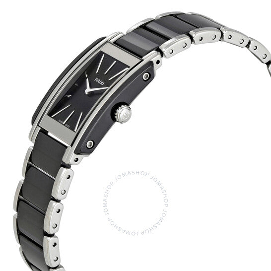 Stainless steel and black ceramic case with a stainless steel bracelet with black ceramic center links. Fixed stainless steel bezel. Black dial with silver-tone hands and index hour markers. Dial Type: Analog. ETA 976.001 quartz movement. Scratch resistant sapphire crystal. Pull / push crown. Solid case back. Case size: 22.7 mm. Rectangle case shape. Band width: 22 mm. Water resistant at 50 meters / 165 feet. Functions: hour, minute. Luxury watch style. Watch label: Swiss Made. Rado Integral Black Dial Ladies Watch R20223152.