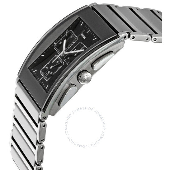 Silver-tone stainless steel case with a silver-tone stainless steel bracelet. Fixed silver-tone stainless steel bezel. Black dial with luminous hands and index hour markers. Minute markers around the outer rim. Dial Type: Analog. Date display at the 6 o'clock position. Chronograph - three sub-dials displaying: 1/10th seconds, 30 minutes, 60 seconds. Rado Calibre 538 quartz movement. Scratch resistant sapphire crystal. Pull / push crown. Solid case back. Rectangle case shape, case size: 38.2 mm x 31 mm, case thickness: 10.8 mm. Hidden push button deployment clasp. Water resistant at 30 meters / 100 feet. Functions: chronograph, date, hour, minute, second. Dress watch style. Watch label: Swiss Made. Rado Integral Chronograph Stainless Steel Men's Watch R20849159.