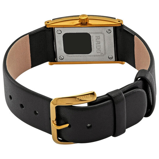 Yellow gold PVD stainless steel case with a black leather strap. Fixed bezel. Black dial with gold-tone hands and diamonds hour markers. Dial Type: Analog. Quartz movement. Scratch resistant sapphire crystal. Pull / push crown. Solid case back. Square case shape. Case size: 19 mm. Buckle clasp. Water resistant at 30 meters / 100 feet. Functions: hour, minute. Dress watch style. Watch label: Swiss Made. Rado Integral Jubile Quartz Diamond Black Dial Ladies Watch R20789755.