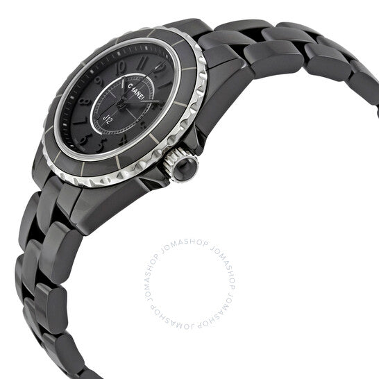 Black high-tech ceramic case and bracelet. Fixed stainless steel bezel with a black ceramic top ring. Black dial with luminous black hands and Arabic numeral hour markers. Minute markers around the outer rim. Dial Type: Analog. Luminescent hands and markers. Quartz movement. Scratch resistant mineral crystal. Screw down crown. Solid case back. Case size: 29 mm. Case thickness: 11 mm. Round case shape. Hidden fold over clasp. Water resistant at 50 meters / 165 feet. Functions: hour, minute, second. Luxury watch style. Watch label: Swiss Made. Chanel J12 Black Dial Ladies Watch H4196.