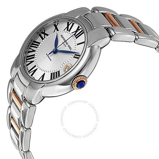 Stainless steel case with a stainless steel bracelet with rose gold PVD links. Fixed stainless steel bezel. Silver dial with blue hands and Roman numeral hour markers. Minute markers around an inner ring. Dial Type: Analog. Date display at the 3 o'clock position. Automatic movement with a 38-hour power reserve. Scratch resistant sapphire crystal. Push / pull crown. Skeleton case back. Round case shape. Case size: 35 mm. Case thickness: 9.7 mm. Band width: 18 mm. Band length: 8.3 inches. Deployment clasp with a push button release. Water resistant at 50 meters / 165 feet. Functions: date, hour, minute, second. Dress watch style. Watch label: Swiss Made. Item Variations: 2935 S5 00659, 2935.S5.00659, 2935S500659. Raymond Weil Jasmine Automatic Silver Dial Ladies Watch 2935-S5-00659.