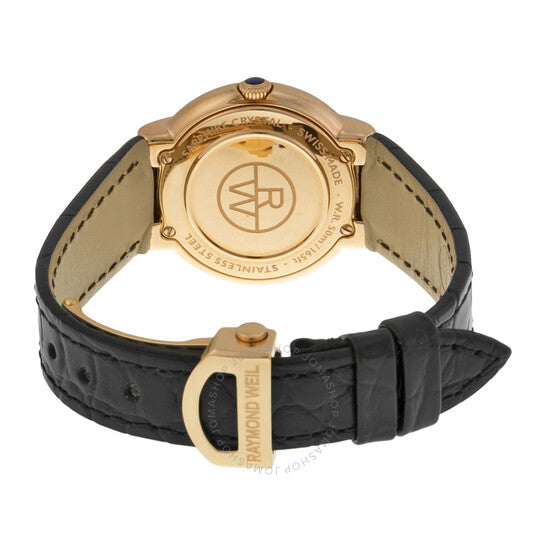 Rose gold PVD stainless steel case with a black leather strap. Fixed rose gold PVD bezel. Silver dial with blue hands and Roman numeral hour markers. Dial Type: Analog. Date display at the 3 o'clock position. Quartz movement. Scratch resistant sapphire crystal. Pull / push crown. Solid case back. Case diameter: 29 mm. Round case shape. Band width: 17.8 mm. Band length: 7 inches. Folding clasp. Water resistant at 50 meters / 165 feet. Functions: date, hour, minute, second. Casual watch style. Watch label: Swiss Made. Raymond Weil Jasmine Silver Dial Black Leather Ladies Watch 5229-PC5-01659.