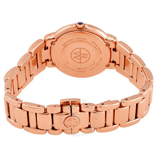 Rose gold PVD stainless steel case and bracelet. Fixed rose gold PVD bezel. Silver dial with blue hands and Roman numeral hour markers. Dial Type: Analog. Date display at the 3 o'clock position. Quartz movement. Scratch resistant sapphire crystal. Push / pull crown. Solid case back. Case diameter: 35 mm. Case thickness: 7.9 mm. Round case shape. Folding clasp. Water resistant at 50 meters / 165 feet. Functions: date, hour, minute. Luxury watch style. Watch label: Swiss Made. Raymond Weil Jasmine Silver Dial Stainless Steel Ladies Watch 5235-P5-01659.