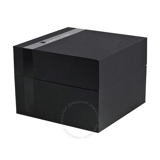 Rose gold PVD stainless steel case with a black leather strap. Fixed rose gold PVD bezel. Grey dial with luminous rose gold-tone hands and index hour markers. Minute markers around the outer rim. Dial Type: Analog. Luminescent hands and markers. Date display at the 4 o'clock position. Chronograph - three sub-dials displaying: 60 second, 30 minute and 12 hour. Hamilton calibre H-21 automatic movement, based upon ETA 7750, containing 25 Jewels, bitting at 28800 vph, and has a power reserve of approximately 60 hours. Scratch resistant sapphire crystal. Skeleton case back. Round case shape. Case size: 42 mm. Case thickness: 7 mm. Band width: 22 mm. Tang clasp. Water resistant at 100 meters / 330 feet. Functions: chronograph, date, hour, minute, second. Jazzmaster Series. Casual watch style. Watch label: Swiss Made. Hamilton Jazzmaster Automatic Chronograph Grey Dial Black Leather Watch H32546781.