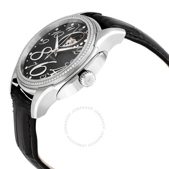 Stainless steel case with a black leather strap. Fixed stainless steel bezel set with diamonds. Black (open heart) dial with silver-tone hands and Arabic numeral hour markers. Dial Type: Analog. ETA caliber 2824-2 automatic movement, based upon ETA 2824, containing 25 Jewels, bitting at 28800 vph, and has a power reserve of approximately 38 hours. Scratch resistant sapphire crystal. Pull / push crown. Transparent case back. Round case shape. Case size: 36 mm. Case thickness: 11 mm. Band width: 18 mm. Band length: 7.5 inches. Tang clasp. Water resistant at 50 meters / 165 feet. Functions: hour, minute, second. Additional Info: 84 white diamonds. Jazzmaster Series. Dress watch style. Watch label: Swiss Made. Hamilton Jazzmaster Automatic Diamond Ladies Watch H32485733.