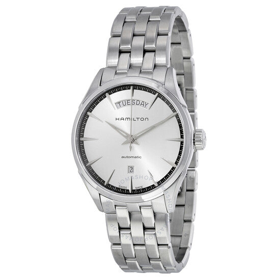 Stainless steel case with a stainless steel bracelet. Fixed stainless steel bezel. Silver dial with silver-tone hands and index hour markers. Minute markers around the outer rim. Date display at the 6 o'clock position. Day of the week display centered on the 12 o'clock position. Automatic movement with an 80-hour power reserve. Scratch resistant sapphire crystal. Pull / push crown. Skeleton case back. Case diameter: 42 mm. Case thickness: 11 mm. Round case shape. Band width: 22 mm. Fold over clasp. Water resistant at 50 meters / 165 feet. Dress watch style. Hamilton Jazzmaster Automatic Silver Dial Stainless Steel Men's Watch H42565151.