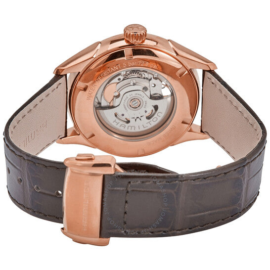 Rose gold-plated stainless steel case with a brown leather strap. Fixed rose gold-plated bezel. Silver (open heart) dial with luminous rose gold-tone dauphine-style hands and index hour markers. Roman numerals mark the 3, 6, 9 and 12 o'clock positions. Minute markers around the outer rim. Dial Type: Analog. Luminescent hands. Hamilton calibre H-10 automatic movement, based upon ETA C07.111, containing 25 Jewels, bitting at 21600 vph, and has a power reserve of approximately 80 hours. Scratch resistant sapphire crystal. Transparent case back. Round case shape. Case size: 42 mm. Case thickness: 11.4 mm. Band width: 22 mm. Butterfly clasp. Water resistant at 50 meters / 165 feet. Functions: hour, minute, second. Casual watch style. Watch label: Swiss Made. Hamilton Jazzmaster Open Heart Automatic Silver Dial Men's Watch H32735551.