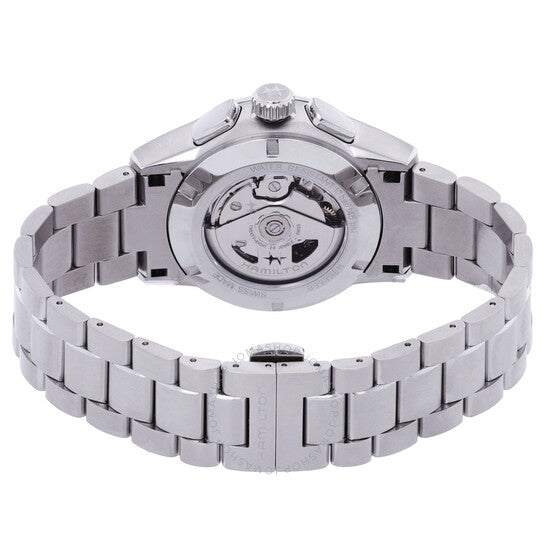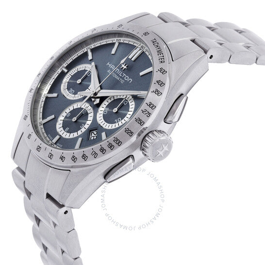 Silver-tone stainless steel case and bracelet. Fixed silver-tone stainless steel bezel. Blue dial with silver-tone hands and index hour markers. Tachymeter scale around the outer rim. Dial Type: Analog. Date display between 4 and 5 o'clock position. Chronograph - two sub-dials displaying: 30 minute and 60 second. Hamilton Calibre H-31 Automatic movement, based upon ETA 7753, containing 27 Jewels, bitting at 28800 vph, and has a power reserve of approximately 60 hours. Scratch resistant sapphire crystal. Screw down crown. Transparent see through case back. Round case shape, case size: 42 mm, case thickness: 15.22 mm. Band width: 22 mm. Butterfly clasp. Water resistant at 100 meters / 330 feet. Functions: chronograph, date, hour, minute, second. Jazzmaster Series. Sport watch style. Watch label: Swiss Made. Hamilton Jazzmaster Performer Autochrono Blue Dial Men's Watch H36656140.