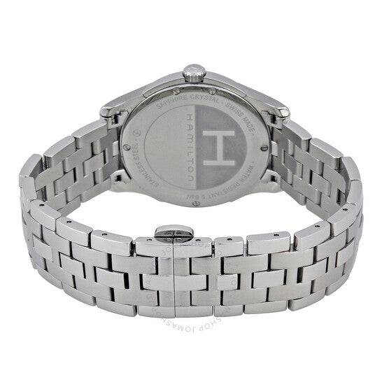 Stainless steel case with a stainless steel bracelet. Fixed stainless steel bezel. Black dial with luminous hands and alternating Arabic numeral and index hour markers. Minute markers around the outer rim,. Dial Type: Analog. Luminescent hands and dial markers. Date display at the 3 o'clock position. Calibre F06.111 quartz movement. Scratch resistant sapphire crystal. Steel crown. Stainless steel case back. Case size: 38 mm. Case thickness: 8 mm. Round case shape. Band width: 20 mm. Band length: 8.5 inches. Push button release clasp. Water resistant at 50 meters / 165 feet. Functions: date, hour, minute, second, battery eol indicator. Fashion watch style. Watch label: Swiss Made. Item Variations: H32411135. Hamilton Jazzmaster Quartz Black Dial Men's Watch H32411135.