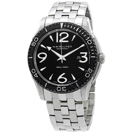 Stainless steel case with a stainless steel bracelet. Uni-directional rotating black stainless steel bezel. Black dial with luminous silver-tone hands and index hour markers. Arabic numerals mark the 3, 6, 9, and 12 o'clock position. Dial Type: Analog. Luminescent hands and markers. Date display at the 3 o'clock position. ETA caliber 2824-2 automatic movement with a 38-hour power reserve. Scratch resistant sapphire crystal. Screw down crown. Transparent case back. Round case shape. Case size: 46 mm. Case thickness: 13 mm. Band width: 24 mm. Band length: 8.5 inches. Deployment clasp. Water resistant at 300 meters / 1000 feet. Functions: hours, minutes, seconds, date. Casual watch style. Watch label: Swiss Made. Hamilton Jazzmaster Seaview Black Dial Men's Watch H37715135.