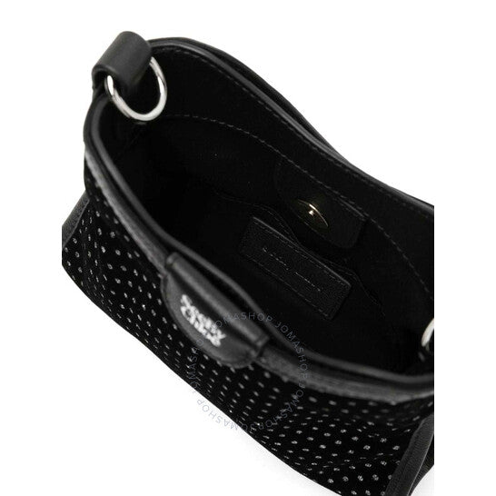 See By Chloe Ladies Shoulder Bag. Joan series. SKU: CHS24SSC25D46001. Color: Black. Size: Width: 7.5" (19 cm) x Height: 5.5" (14 cm) x Depth: 2.4" (6 cm). See by Chloe Joan Mini Top Handle Bag. The Joan mini top handle purse exudes cocktail elegance with its sparkling velvet construction. Designed in a compact, scaled-down silhouette, it features a slouchy top handle for a relaxed yet chic look. Versatile in carry options, it comes with a removable, adjustable strap for shoulder, finger, or hand carry. The purse is secured with a snap button closure and includes a flat inside pocket for essentials. Finished with a signature See by Chloe logo and lined with cotton canvas, this stylish accessory blends glamour with practicality. Min. strap drop: 17.3" (44 cm), Max. strap drop: 20.5â (52 cm).