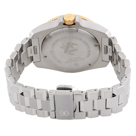 Silver-tone stainless steel case and bracelet. Uni-directional rotating green ceramic bezel. Green dial with luminous hands and index-Arabic numeral hour markers. Minute markers around the outer rim. Dial Type: Analog. Luminescent hands and markers. Date display at the 6 o'clock position. Ronda Caliber 715 quartz movement. Scratch resistant sapphire crystal. Screw down crown. Solid case back. Round case shape, case size: 43 mm, case thickness: 12 mm. Band width: 21 mm. Deployment with push button release clasp. Water resistant at 200 meters / 660 feet. Functions: date, hour, minute, second. Journey 1884 Series. Sport watch style. Watch label: Swiss Made. Victorinox Journey 1884 Chronograph Quartz Green Dial Men's Watch 242012.