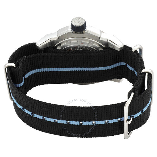 Silver-tone stainless steel case with a black and blue NATO band. Uni-directional rotating blue ceramic bezel. White dial with silver-tone hands and index hour markers. Minute markers around the outer rim. Dial Type: Analog. Luminescent hands and markers. Date display at the 6 o'clock position. Automatic movement. Scratch resistant sapphire crystal. Round case shape, case size: 44 mm. Buckle clasp. Water resistant at 300 meters / 1000 feet. Functions: date, hour, minute, second. Jsh Series. Watch label: Swiss Made. Armand Nicolet JSH Automatic White Dial Men's Watch A480PGU-AU-BN24480AANU.