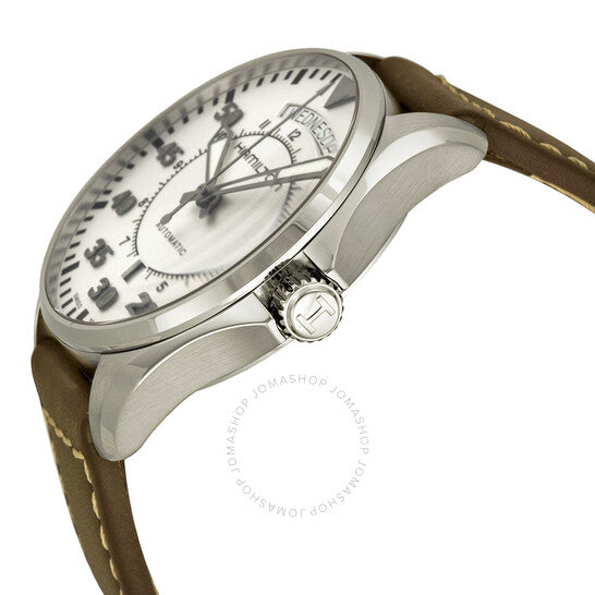 Stainless steel case with a brown leather strap. Fixed stainless steel bezel. Silver dial with luminous silver-tone hands and Arabic numeral hour markers. Arabic numeral minute markers (at 5 minute intervals). Minute markers around the outer rim. Dial Type: Analog. Luminescent hands and markers. Date display at the 6 o'clock position. Day of the week display centered on the 12 o'clock position. Hamilton calibre H-40 automatic movement with an 80-hour power reserve. Scratch resistant sapphire crystal. Pull / push crown. Skeleton case back. Case size: 42 mm. Case thickness: 12 mm. Round case shape. Band width: 20 mm. Tang clasp. Water resistant at 100 meters / 330 feet. Functions: date, day, hour, minute, second. Casual watch style. Watch label: Swiss Made. Hamilton Khaki Aviation Pilot Automatic Men's Watch Watch H64615555.