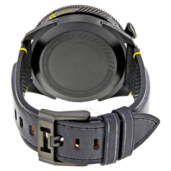 Black PVD stainless steel case with a black leather strap. Fixed black PVD bezel. Black dial with luminous hands and Arabic numeral hour markers. Minute markers around the outer rim. Dial Type: Analog. Luminescent hands and markers. Date display at the 3 o'clock position. Chronograph - two sub-dials displaying: 60 second and 30 minute. Automatic movement with a 60-hour power reserve. Scratch resistant sapphire crystal. Screw down crown. Transparent case back. Case diameter: 46 mm. Case thickness: 16 mm. Round case shape. Band width: 22 mm. Tang clasp. Water resistant at 50 meters / 165 feet. Functions: chronograph, date, hour, minute, second. Additional Info: Bi-directional turning flange - capacity to record a countdown. Casual watch style. Hamilton Khaki Aviation Takeoff Automatic Chronograph Black Dial Black Leather Men's Watch H76786733.
