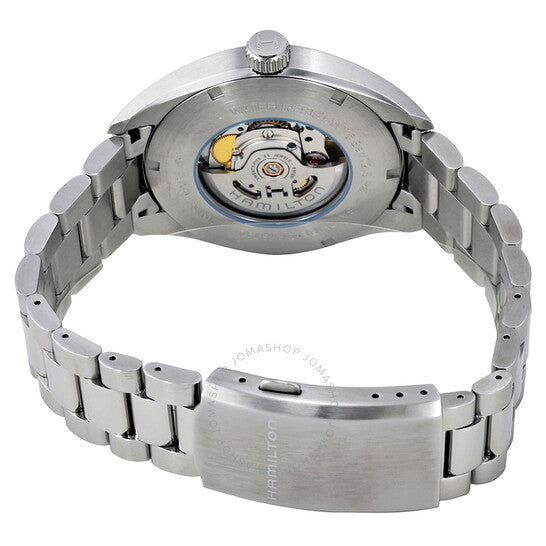 Stainless steel case with a stainless steel bracelet. Fixed stainless steel bezel. Black dial with silver-tone sword-shaped hands and Arabic numeral hour markers. 24 hour markers. Minute markers around the outer rim. Dial Type: Analog. Luminescent hands and markers. Date display at the 6 o'clock position. Day of the week display below the 12 o'clock position. Hamilton calibre H-30 automatic movement, based upon ETA C07.111, containing 25 Jewels, bitting at 21600 vph, and has a power reserve of approximately 80 hours. Scratch resistant sapphire crystal. Pull / push crown. Transparent case back. Round case shape. Case size: 42 mm. Case thickness: 10 mm. Band width: 20 mm. Fold over clasp with a push button release. Water resistant at 50 meters / 165 feet. Functions: date, day, hour, minute, second, 24 hour. Khaki Field Series. Casual watch style. Watch label: Swiss Made. Hamilton Khaki Field Automatic Black Dial Men's Watch H70505133.